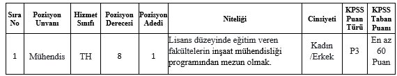 İlan edilen unvanlar için, mezun olunan okul itibari ile öğrenim şartını taşımak ve bu öğrenimle ilgili olarak 2024 yılı Kamu Personel Seçme Sınavından (KPSS (B) grubu) alım yapılacak unvan karşısındaki puan türünden, belirtilen asgari KPSS puanını almış olmak.